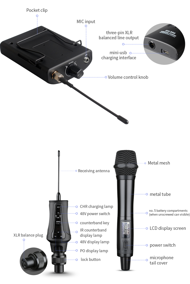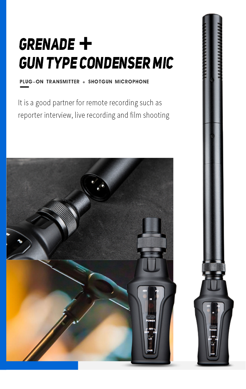 High-quality microphone, great for interviews. This handheld microphone is much better suited for loud-noise environments where the audio needs to be directly picked up by the capsule. Similar construction to other manufacturers, the microphone and receiver pair up easily and deliver crisp sound instantly. Built-in lithium batteries. If you are encountering interference, you can easily change the channel to a different one for better connection. This unit uses uhf radio bandwidth and does not interfere with Wi-Fi networks when in use. The receiver mounts to a camera shoe and delivers high-quality sound via xlr or mini Jack cables.