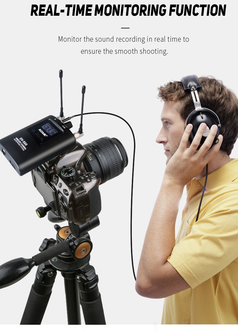 【Superior Sound Quality】The wireless camera microphone receives crystal clear sound and then transmits it to your DSLR camera through UHF digital wireless technology. The recorded sound is processed by noise cancelling to restore high fidelity, and the 0s delay transmission range is 164 feet (50m). UHF digital can provide a stronger signal which reducing the interference of Bluetooth or WiFi.
