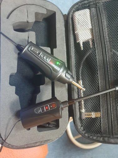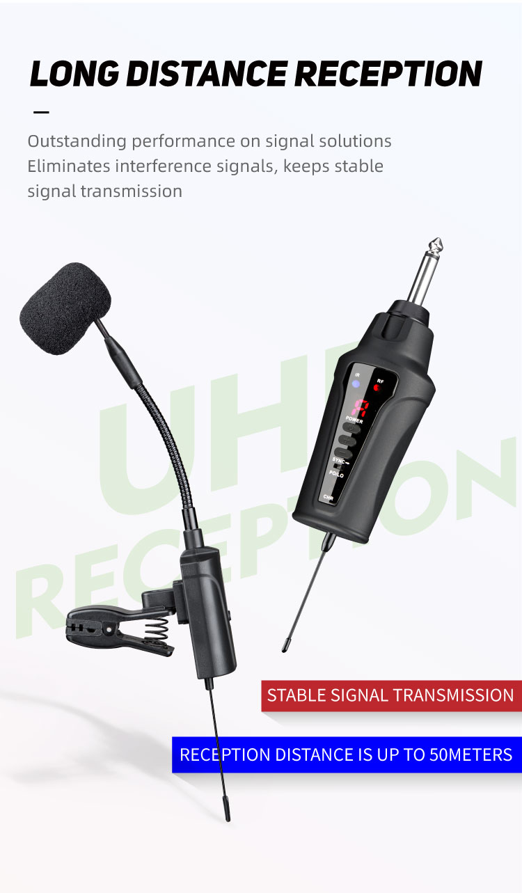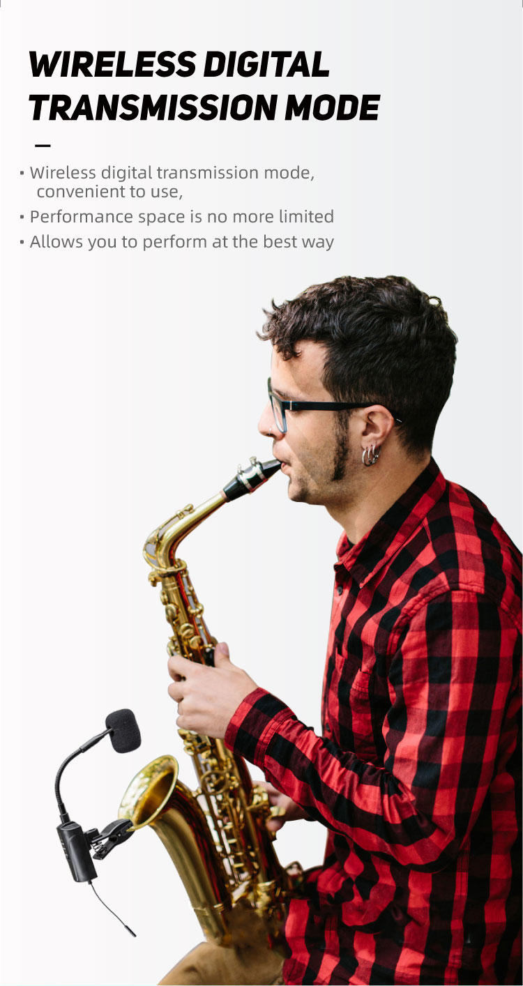 About this item:【UHF Stable Transmission】The wireless saxophone microphone utilizes UHF frequency and advanced digital audio transmission technology, featuring infrared automatic pairing, a 48kHz sampling rate, and an ultra-short audio delay. This ensures recording-quality sound transmission. The system offers stable transmission up to 164ft in open areas. (Note: Please ensure the antenna on the bottom of the receiver is installed before formal use.)【High Quality Sound Reproduction】The wireless saxophone microphone with its built-in highly sensitive condenser mic, perfectly captures the instrument's soundtrack, delivering sound that is clearer and more realistic. It's ideal for saxophones, trumpets, tubas, etc. It includes a 6.35mm to 3.5mm adapter for compatibility with various active PA systems, active speakers, amplifiers, and audio mixers. Also included with a carrying case for easy and secure to travel with any show.【16 Adjustable Channels】This wireless saxophone microphone provides 16 preset groups of adjustable channels to address potential interference issues and supports up to 4 systems for use on the same occasion. To pair the systems, match the first transmitter with the first receiver by setting them to the same channel. When pairing the second set, it is recommended to select a channel number that is more than 3 channels apart from the first one. Follow the same method for subsequent systems until all four are matched.【Flexible Gooseneck Design】The clip featuring rubber padding, is firm and steady, leaving no damage to your saxophone, trumpet, tuba, etc. The gooseneck is designed for flexibility and crafted from high-quality materials, ensuring stability and ease of adjustment without the annoying rebound.【6 Hours Continuous Use Time】This wireless saxophone microphone is equipped with a built-in rechargeable battery, offers 6 hours of continuous use after a 2 to 3-hour charge. Included in the package is a 2-in-1 charging cable for simultaneously charging both the transmitter and receiver. Ideal for gigs, weddings, church, teaching, band performances, pub shows, personal musician performances, and small concerts.