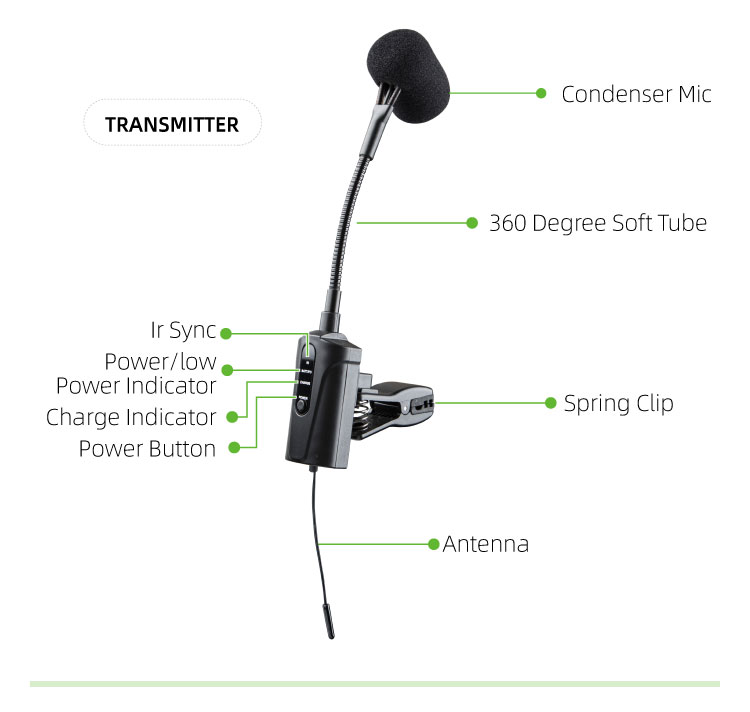 (606-630 MHz Optional), (USA: 902-928, UK: 863-865, ROK: 925-937 MHz)Modulation mode: pi/4 DQPSKTransmitter power: 10mWSensitivity: -47 db±2dBFrequency change: IR synchMicrophone type: CondenserMicrophone dimension: Φ14*5.0mmPower supply: 3.7V lithium batteryPower consumption:>6 hours continuously usingDimension: 125*40*20mm